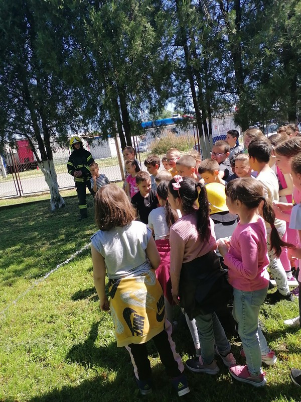Данас су чланови ватрогасне станице посетили нашу школу. Извели су показну вежбу под претпоставком да је дошло до пожара у школској архиви- зборници, при чему је изведена и евакација ученика који се због задимљења одвојио од разреда и изгубио.