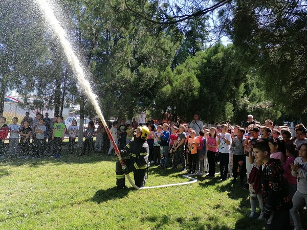 Такође, ученици су имали прилику да изблиза погледају опрему који ватрогасци користе и да у дворишту школе виде на које се све начине гасе пожари.